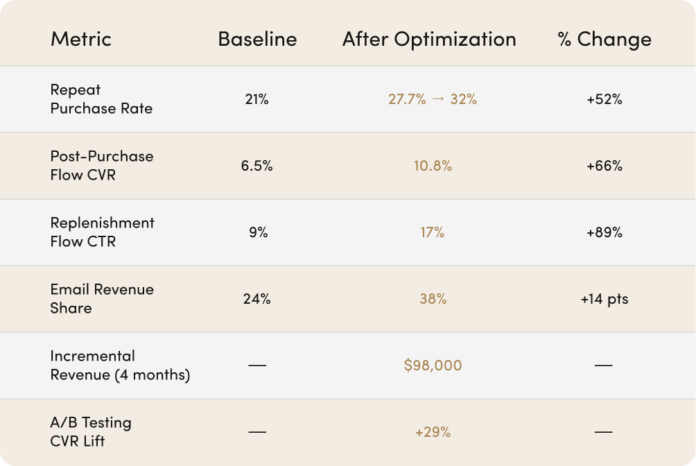 This DTC skincare brand had strong acquisition but weak retention. First-time buyers loved the product, yet too many disappeared after their initial order. Their emails were generic, post-purchase communication was minimal, and replenishment timing was guesswork.