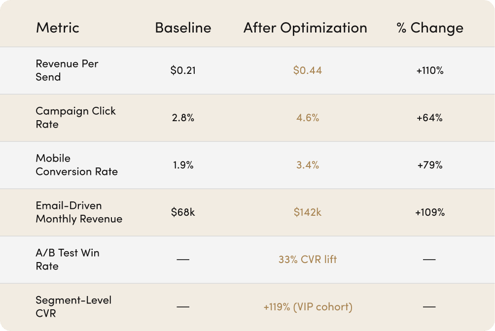 Every message became more relevant. Every send worked harder. Email stopped being “just another channel” and became a predictable revenue driver.